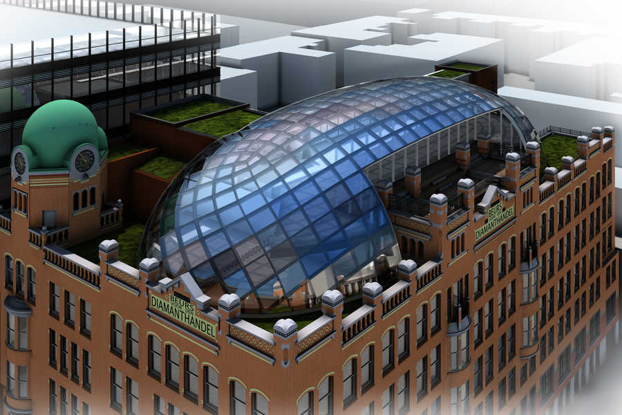 Hermans Techniglaz uit Bergschenhoek heeft de opdracht gekregen om op maat gemaakte en geïsoleerde PowerGlaz BIPV-panelen te leveren voor de Diamantbeurs in Amsterdam. BIPV staat voor building integrated photovoltaic, de integratie van PV-panelen in gevels, daken of lichtstraten. De BIPV-panelen worden toegepast in de glaskoepel waaronder een dakterras, restaurant en loungebar komen. De geïntegreerde zonnecellen wekken energie op en hebben tevens een zonwerende functie om het binnenklimaat zo stabiel mogelijk te houden. Het totaal geïnstalleerde vermogen is ruim 25 kWp, in combinatie met een lichtdoorlaatbaarheid van circa 25 procent. De 132 geïsoleerde panelen zullen voorzien worden van een zonwerende coating en een argon gevulde warm edge spacer. De panelen, met 66 verschillende maten en een totaal oppervlak van 300 vierkante meter, worden naar verwachting rond mei geplaatst.