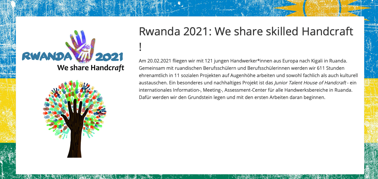 Onder het motto ‘Rwanda2021 We share skilled Handcraft’ wordt in februari 2021 een grootschalig uitwisselingsprogramma georganiseerd voor Europese ambachtslieden uit de bouwnijverheid naar Rwanda in Oost-Afrika. In totaal zullen 121 jonge vakmensen uit Europa naar de hoofdstad Kigali reizen om op elf locaties aan sociale projecten te werken, samen met Rwandese aankomende vakgenoten. Voor deelname aan dit Duitse project komen ook jonge Nederlandse bouwvakkers, zoals glaszetters, in aanmerking.