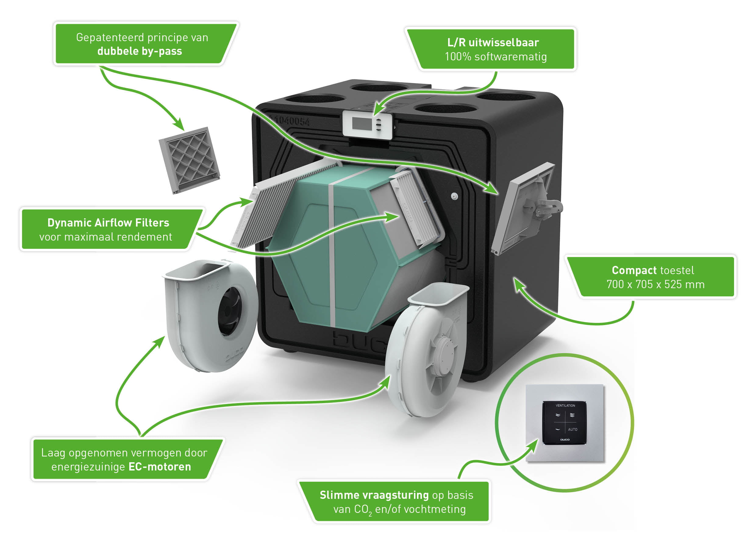 Duco brengt de DucoBox Energy Comfort op de markt, een compacte en lichte variant als uitbreiding binnen het aanbod balansventilatie. Deze nieuwe WTW-unit heeft een capaciteit tot 325 m³/h en werkt vraaggestuurd op basis van CO2 en vocht. Het resultaat is volgens Duco een intelligente en energiezuinige werking. Ook de Dynamic Airflow luchtverdeelfilters verhogen het rendement. Alle Duco-sensoren en/of bedieningsschakelaars zijn door het modulaire principe compatibel met de nieuwe ventilatie-unit.