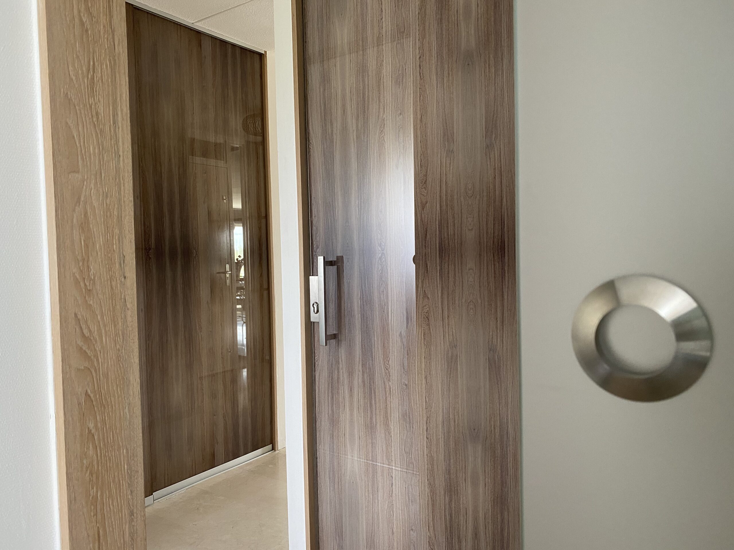 Met het vervangen van de deuren is de logistiek op een aantal plekken veranderd. De badkamer is ensuite geworden; de oude doorgang is dichtgemaakt ten behoeve van een bronzen spiegel van 1.000 x 2.4000 millimeter. De slaapkamer en het kantoor hebben een schuifdeur gekregen met geëtst glas. Die van de slaapkamer heeft een driedubbele functie daar de schuifdeur óf de slaapkamer afsluit, óf de badkamer óf volledig opzijschuift zodat beide ruimten open zijn.