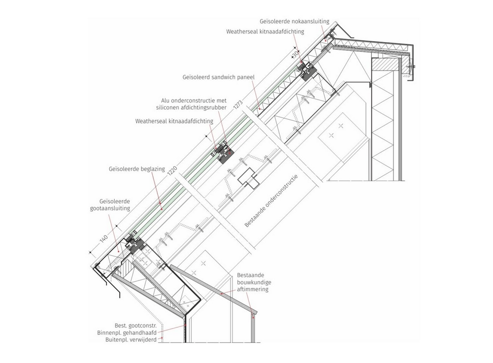De nieuwe dakconstructie bestaat uit speciaal ontwikkeld basisprofiel en een siliconenprofiel (T-stuk) dat zorgt voor de afwatering. Het profiel is verder horizontaal en verticaal vierzijdig structureel afgekit. De bestaande aluminium draagconstructie was nog in goede staat en is daarom gehandhaafd.