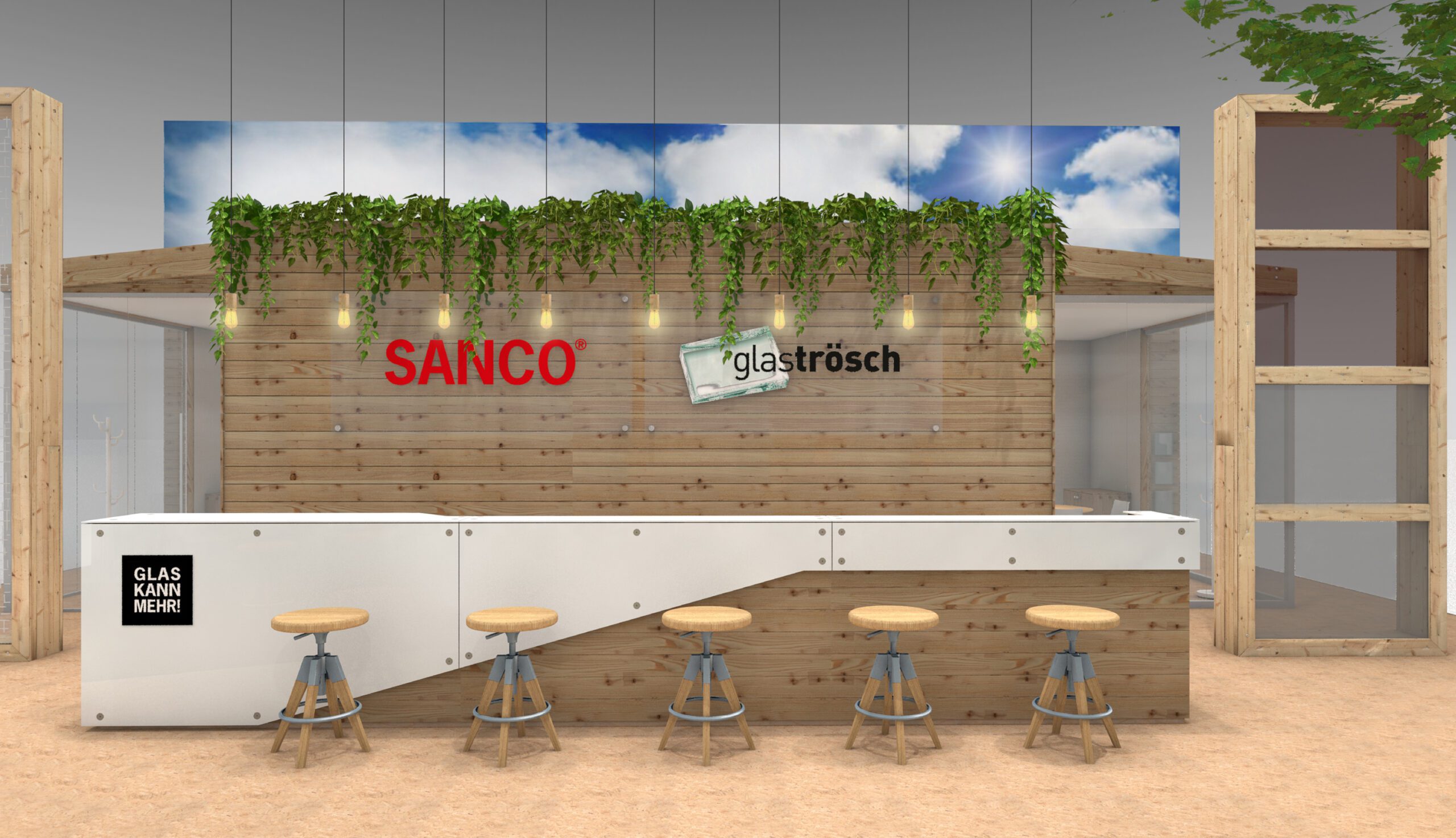 Een resultaat van de nieuwe aanpak is de beursstand op BAU in München. Niets op de stand is permanent vastgelijmd; alle componenten worden eenvoudig in elkaar geschoven of vastgeschroefd. En waar mogelijk gebruiken Glas Trösch en SANCO C2C-gecertificeerde en recyclebare materialen. De nieuwe beursstrategie is erop gericht om afval van materialen voor eenmalig gebruik, de hoeveelheid geproduceerd afval en alle milieubelastende effecten tot een absoluut minimum te beperken. In samenwerking met standbouwer Zeissig ontwikkelde de groep een concept dat het gebruik van verpakkingen achterwege laat, transport minimaliseert en recyclebare materialen gebruikt. Om aan deze eisen te voldoen, zijn alle structurele delen van de stand gemaakt van massief, onbehandeld hout. Die zijn met sleuven of schroeven aan elkaar bevestigd. De stand is daardoor eenvoudig te demonteren en te hergebruiken op andere beurzen.