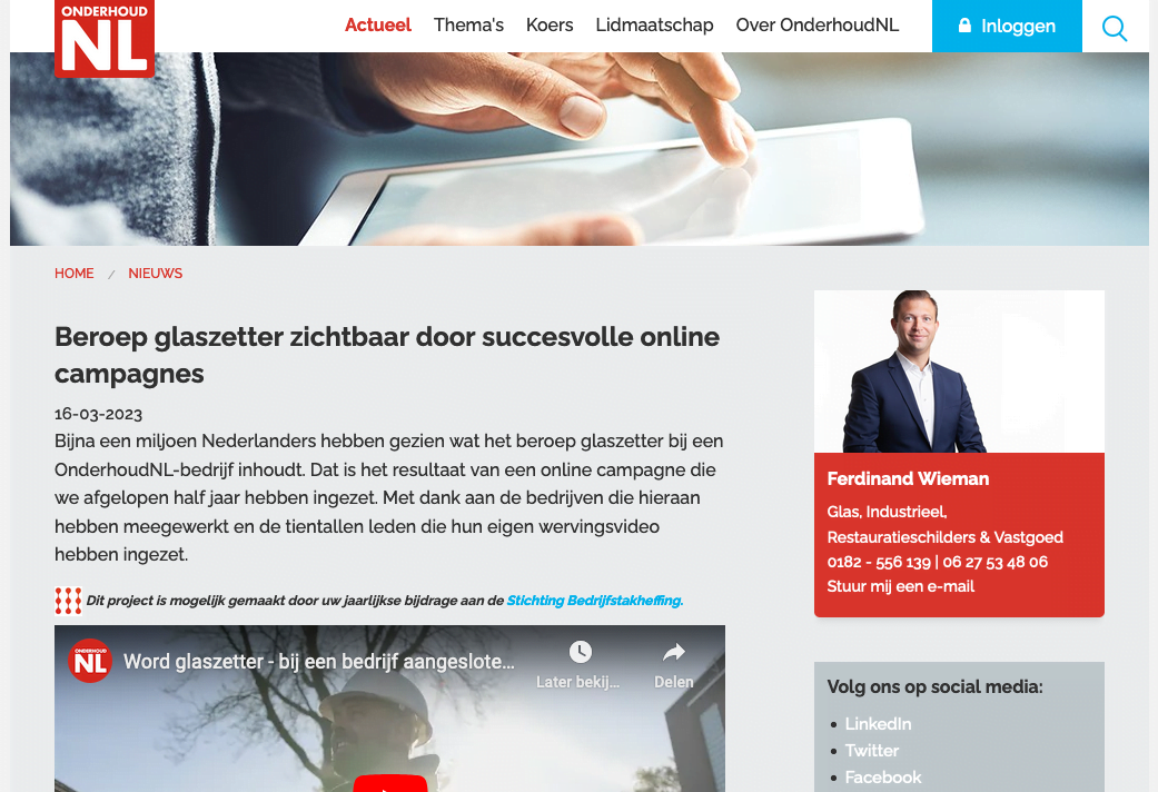 Bijna een miljoen Nederlanders heeft gezien wat het beroep glaszetter bij een OnderhoudNL-bedrijf inhoudt. Dat is het resultaat van een online campagne die OnderhoudNL het afgelopen half jaar heeft ingezet. Dit ‘met dank aan de bedrijven die hieraan hebben meegewerkt en de tientallen leden die hun eigen wervingsvideo hebben ingezet’, aldus OnderhoudNL.