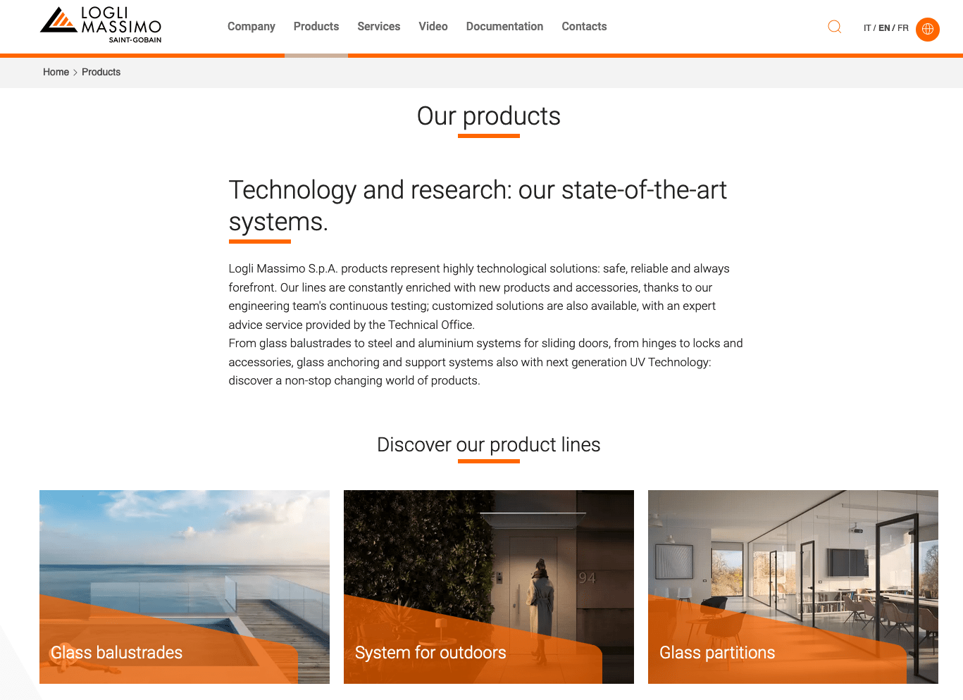 Logli Massimo Saint-Gobain heeft een nieuwe website. Het Italiaanse bedrijf is producent van onder meer railsystemen, glasbalustrades, systemen voor schuifdeuren en glazen scheidingswanden, glasbeslag voor douchecabines en glasluifels. Logli Massimo levert een steeds breder programma glasbeslag en glassystemen; een nieuwe website past daarbij.