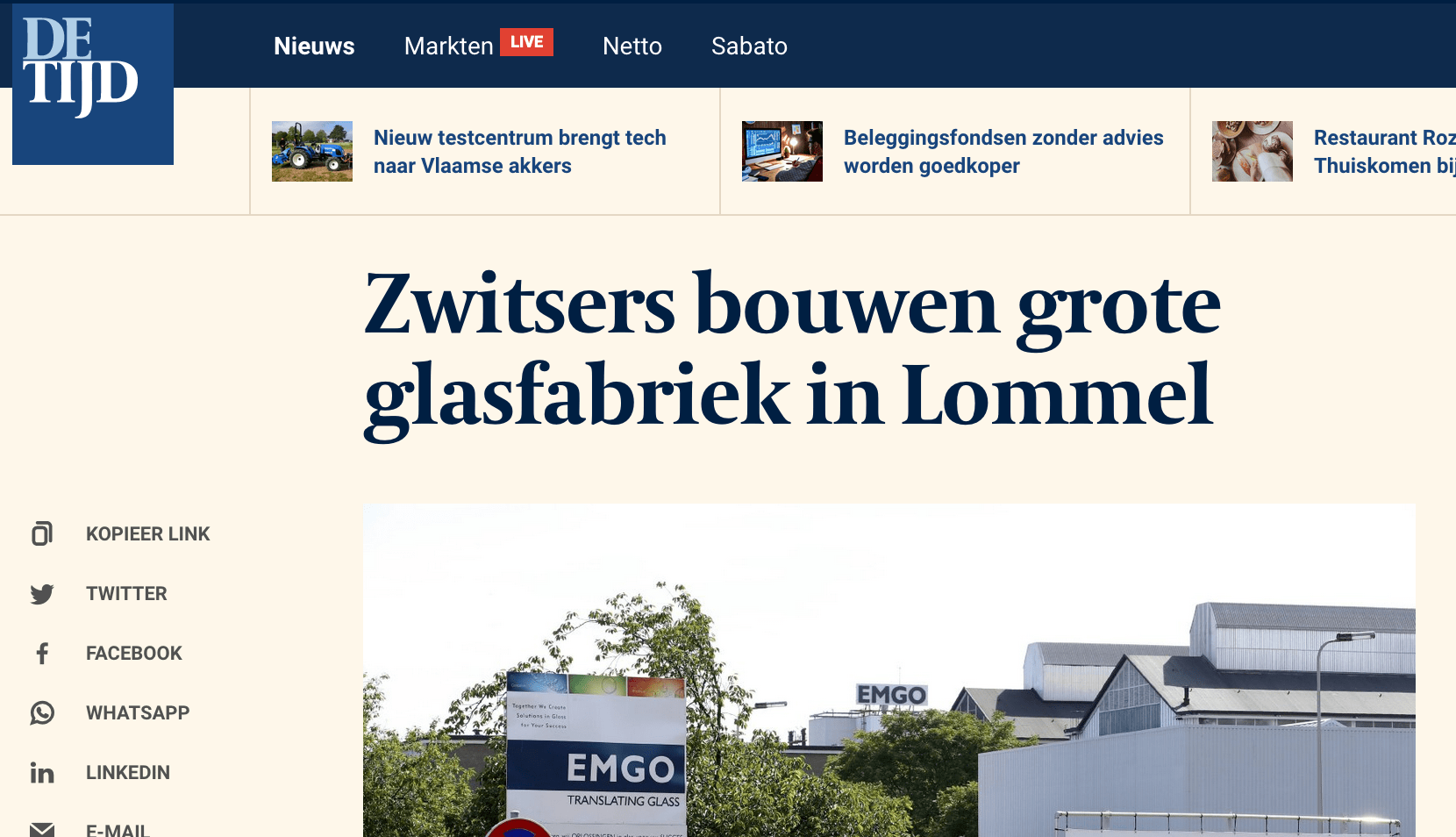 Het Zwitserse familiebedrijf Glas Trösch gaat een nieuwe floatglasfabriek bouwen in Lommel. Met de productie is een investering van honderden miljoenen euro’s gemoeid, goed voor 300 directe banen. Dat lezen we op de site van De Tijd.