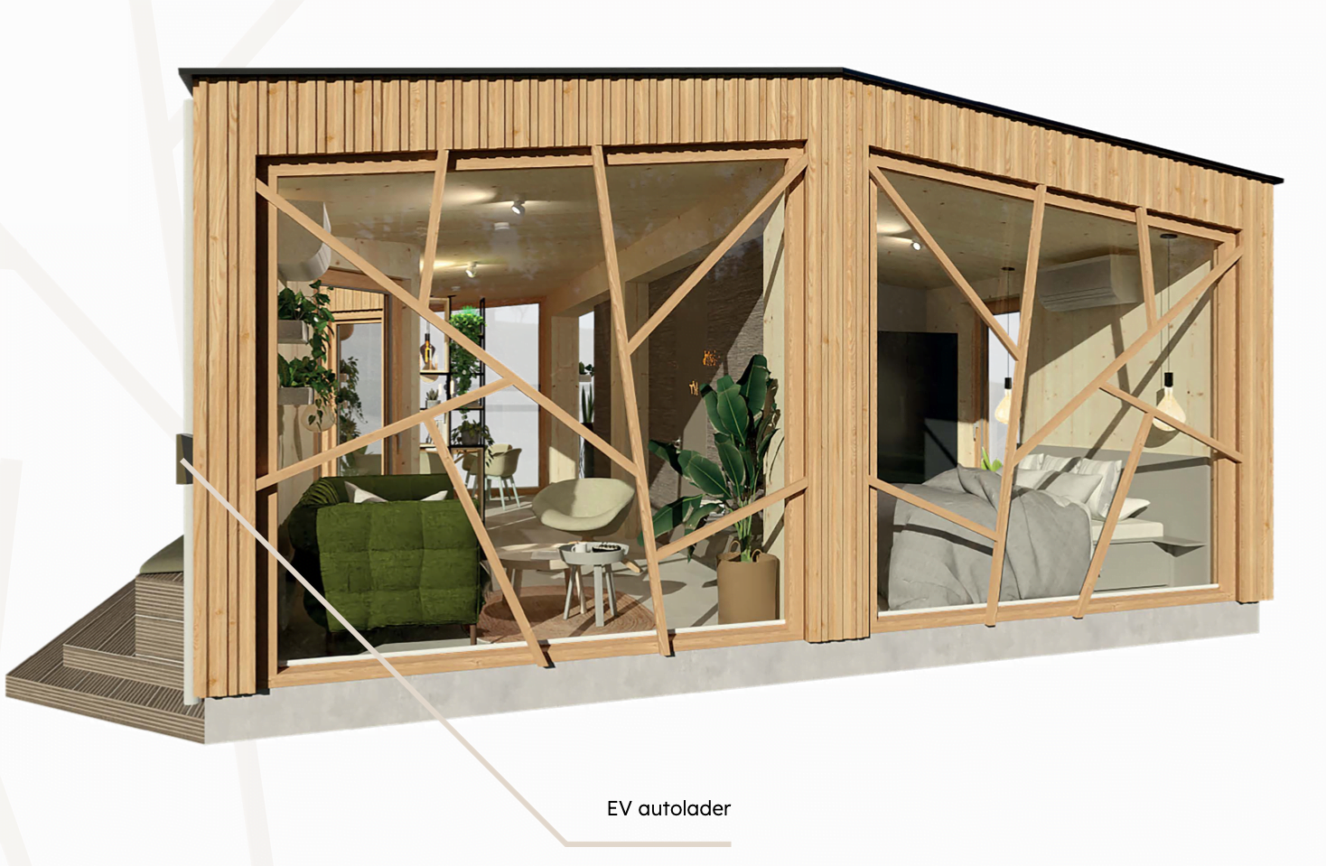 Start-up MUBE Spaces lanceerde begin juni z’n eerste biofilische, biobased en modulaire woonoplossing in Nederland. Deze MUBE 60L is een houten, permanente kwaliteitswoning die voldoet aan het Bouwbesluit nieuwbouw. Het ontwerp is van ORGA architect en de start-up maakt de woning vanuit het biofilisch gedachtegoed vrijwel volledig van natuurlijke materialen. In het biobased tiny house valt vooral het takkenraam op. Nu nog met HR++ glas, waar wellicht vacuümglas, low-carbon glass en/of circulair glas beter op hun plek zijn.