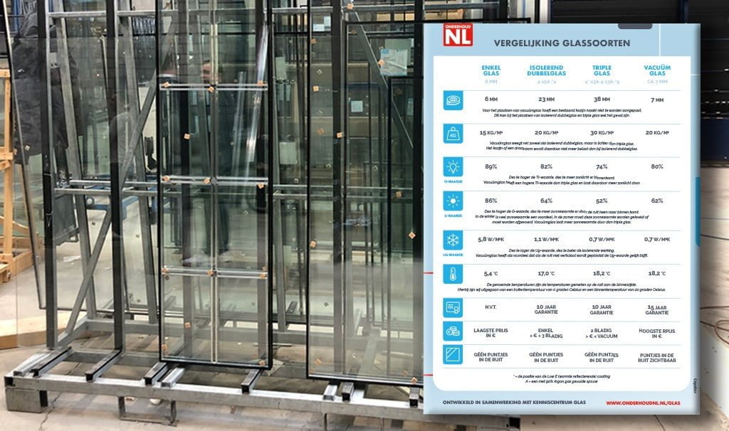 OnderhoudNL Glas heeft in samenwerking met Kenniscentrum Glas de factsheet ‘Vergelijking Glassoorten’ ontwikkeld met daarop een overzicht van de verschillen tussen onder andere vacuüm glas en regulier isolatieglas. Handig om te gebruiken als extra service richting je opdrachtgevers. Je kunt de factsheet (na inloggen) hier kosteloos downloaden.