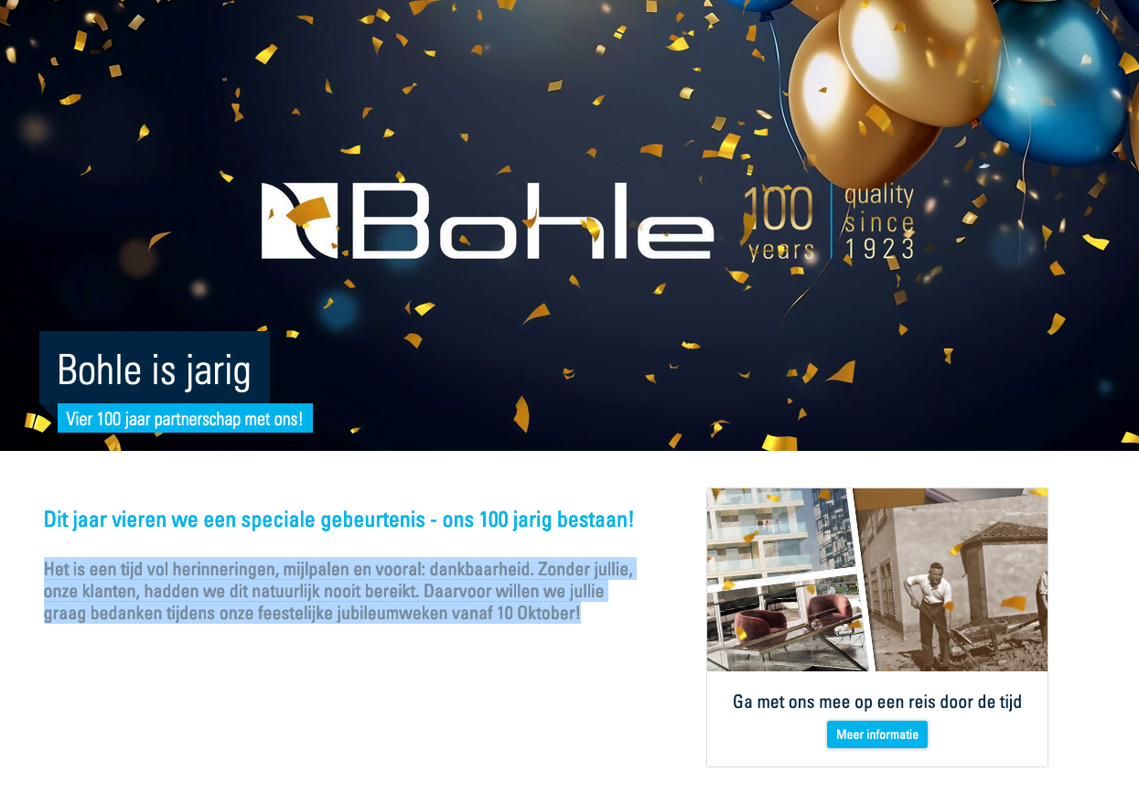 Het jubileum is voor Bohle Benelux reden volgende week een actie te starten waarbij klanten 1.500 euro kunnen winnen. Op de site zegt het bedrijf uit Veenendaal het volgende hierover. ‘Het is een tijd vol herinneringen, mijlpalen en vooral: dankbaarheid. Zonder jullie, onze klanten, hadden we dit natuurlijk nooit bereikt. Daarvoor willen we jullie graag bedanken tijdens onze feestelijke jubileumweken vanaf 10 oktober!’