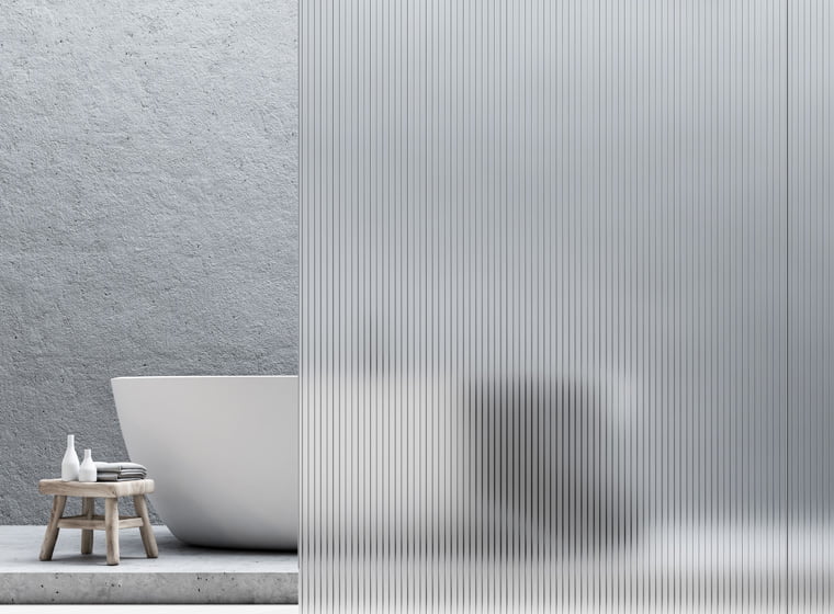 Het satijnglas verzekert helderheid en privacy door de afwisselende gesatineerde profielen en smalle, niet-transparante maar licht gegolfde groeven. De verhouding tussen gegroefd en gesatineerd oppervlak is zorgvuldig gekalibreerd. ‘Het ritme dat zich oplegt aan het oog en de vingertoppen verrijkt de sfeer met onmerkbare trillingen.’