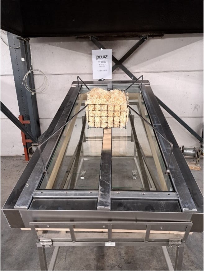 De vliegvuurtest gebeurt met een stalen korf van 300 x 300 x 200 millimeter gevuld met houten krullen. Deze mand plaats je in het midden van het testelement en je steekt de houten krullen in brand.