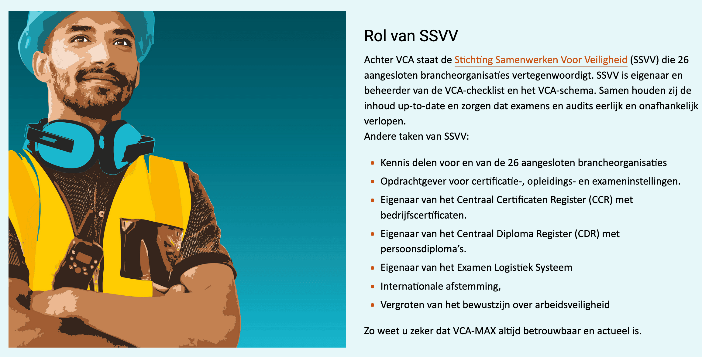 SSVV, als eigenaar en beheerder van het VCA-stelsel, borgt dat de inhoud van VCA-MAX actueel, objectief en onafhankelijk blijft. De stichting beheert het Centraal Certificaten Register (CCR) en het Centraal Diploma Register (CDR). Ook stemt ze het stelsel internationaal af om de kwaliteit en uniformiteit van certificering te garanderen. Met de introductie van VCA-MAX geeft SSVV invulling aan haar missie om structureel veiliger en gezonder werken in risicovolle sectoren te realiseren. Organisaties die hun veiligheidscultuur willen versterken, kunnen zich vanaf nu aanmelden voor VCA-MAX via hun certificerende instelling.