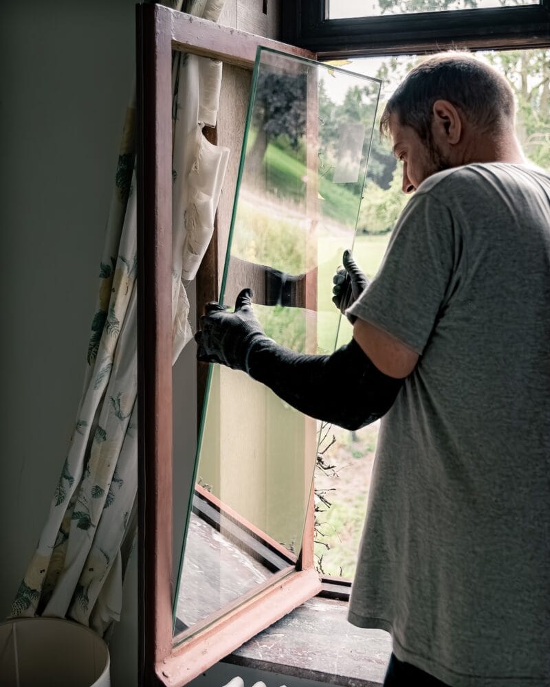 De vervanging van de beglazing, die ongeveer twee weken in beslag nam, is op de oude, traditionele manier uitgevoerd. Na het frezen en schoonmaken van de bestaande sponningen is er een stopverf vervangende kit aangebracht om het glas in te voegen. Tenslotte is het schilderwerk aangepakt. Slechts in enkele gevallen was het nodig om de raamvleugels te verwijderen om bepaalde freeswerkzaamheden efficiënter te kunnen uitvoeren.