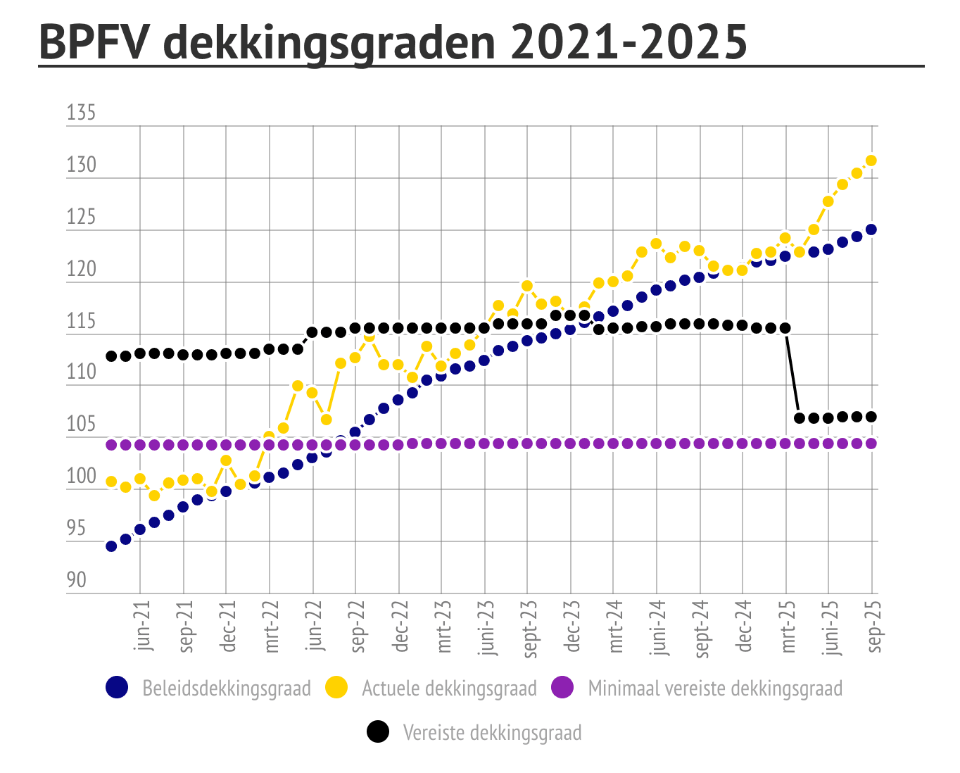 De beleggingen van het BPFV deden het goed in september. Dat zorgde voor een stijging van het vermogen. Door de stijging van de rente en de toename van het vermogen steeg de actuele dekkingsgraad met naar ruim 130 procent. De beleidsdekkingsgraad steeg met 0,7 procent. Dit komt doordat de dekkingsgraad van september 2024 (122,9%) is vervangen door de hogere dekkingsgraad van september 2025 (131,6%) in het twaalf maandelijks gemiddelde.