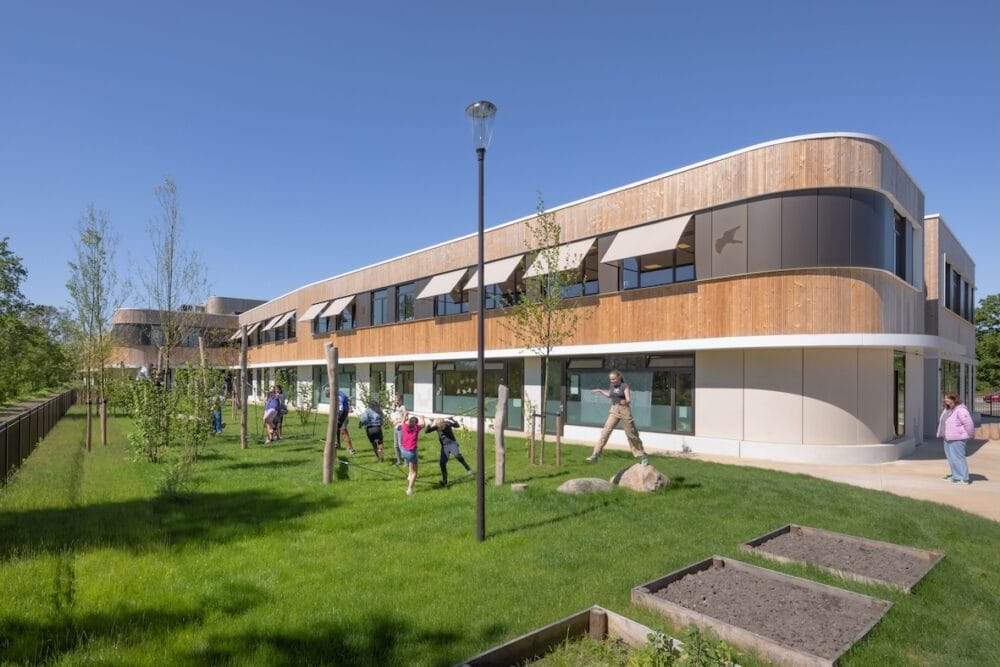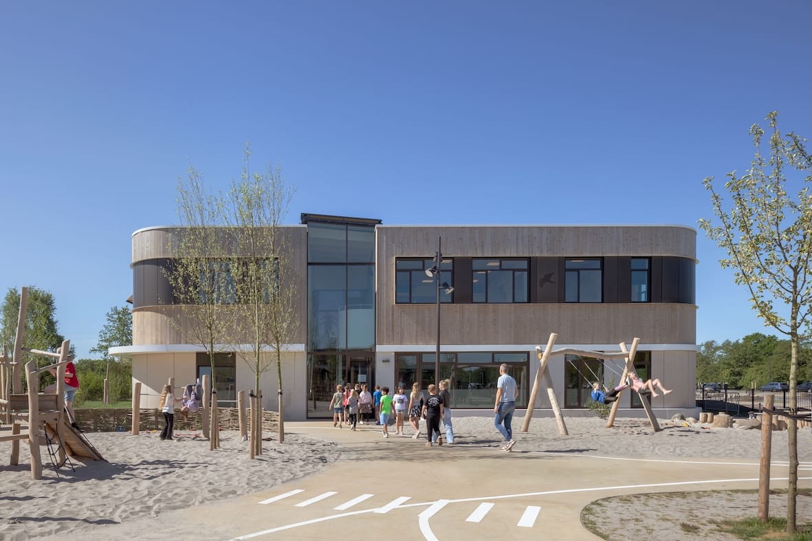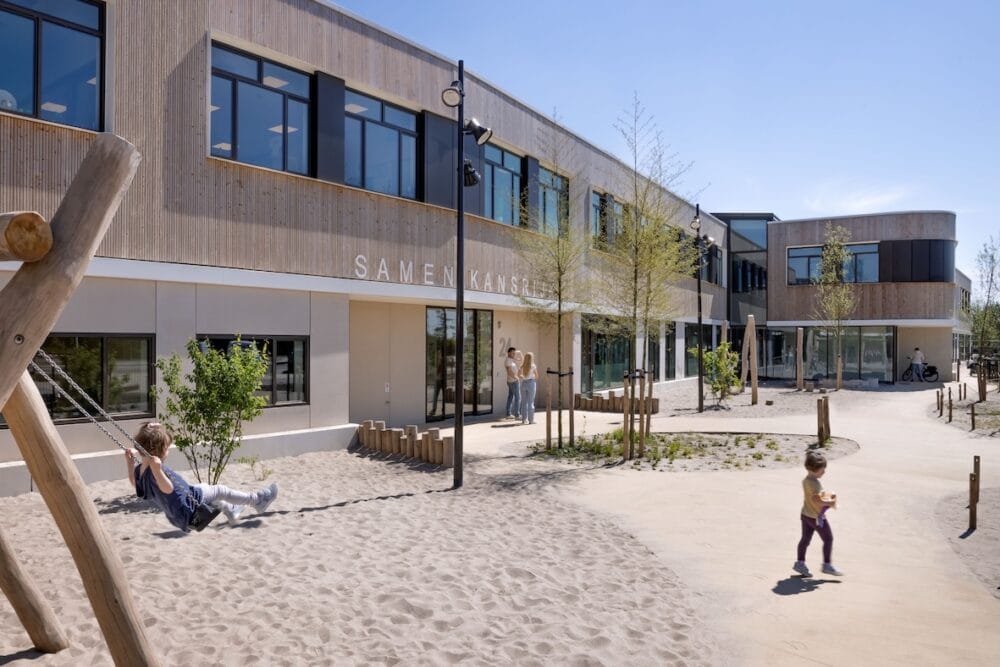 Door het gebouw in drie delen te schuiven, ontstonden een voorplein, beschutte buitenspeelruimtes en herkenbare nevenentrees. De gebogen houten gevels versterken het vriendelijke karakter van het gebouw. De transparante entrees met dubbelglas zijn strategisch geplaatst in het midden, op scharnierpunten en aan de uiteinden, waardoor ze gemakkelijk te vinden zijn. Dankzij de licht gebogen vurenhouten gevels en afgeronde hoeken oogt het gebouw vriendelijk en uitnodigend. Samen Kansrijk biedt naast onderwijsruimten ook voorzieningen als een sporthal, een therapiebad en een kapschuur voor techniek- en groenlessen. Zo krijgen alle kinderen ruimte om zich op hun eigen manier te ontwikkelen.