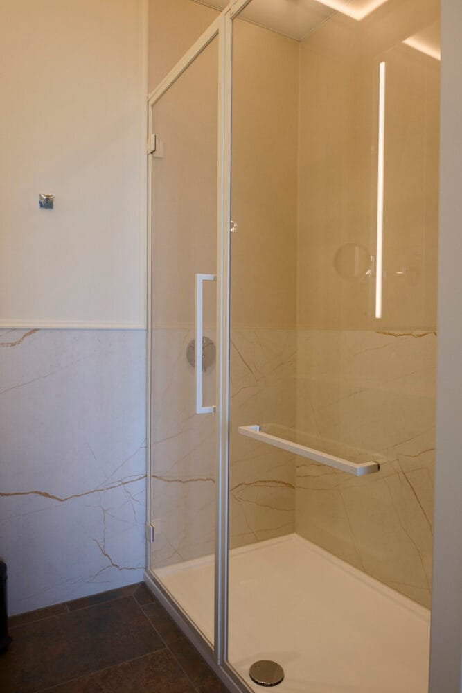 Volgens Kurvers was dat behoorlijk complex om te maken en hij stelde dan ook voor om het marmer te printen. ‘Ons advies is opgevolgd en zo hebben we alle kamers in het Carré van glaswanden voorzien, telkens opgebouwd uit drie verticale glasplaten met een minimale voeg. Het glas is aan de woonzijde voorzien van de marmerprint en aluminium bekleding, en aan de badkamerzijde van een spiegel en het badmeubel dat ook is bekleed met ons glas in marmerlook. De gepoedercoate profielen voor de kadering aan de bovenzijde hebben we op het glas verlijmd.’